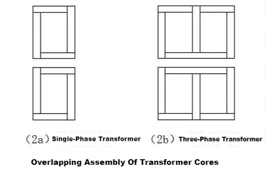 Como o fluxo magnético no núcleo de ferro do transformador é um fluxo alternado, para reduzir a perda de corrente parasita, o núcleo de ferro do transformador é geralmente feito de um certo tamanho de chip de ferro feito de chapa de aço silício com alta resistividade. A chapa de aço silício composta pelo núcleo de ferro é primeiro cortada na forma e tamanho desejados, ou seja, a chapa de punção, e depois combinada com a chapa de punção de forma sobreposta. A Figura 2A mostra o núcleo de ferro de um transformador monofásico. Cada camada consiste em 4 folhas de cobertura. FIGO. 2b mostra o núcleo de ferro do transformador trifásico, cada camada é composta por 6 peças, e a combinação de peças perfuradas de cada duas camadas aplica diferentes métodos de arranjo para escalonar a junção do circuito magnético de cada camada. Este método de montagem é chamado de montagem sobreposta, que pode evitar que correntes parasitas fluam entre as chapas de aço. E como as camadas são entrelaçadas e embutidas, menos fixadores podem ser usados para simplificar a estrutura quando o núcleo é pressionado. Ao montar, as peças de punção são primeiro sobrepostas para formar um núcleo de ferro inteiro, então o garfo inferior é preso, as peças de perfuração do garfo superior são puxadas para expor a coluna de núcleo de ferro, os enrolamentos pré-fabricados são colocados na coluna de núcleo de ferro e finalmente, as peças de punção da forquilha superior desenhadas são inseridas.