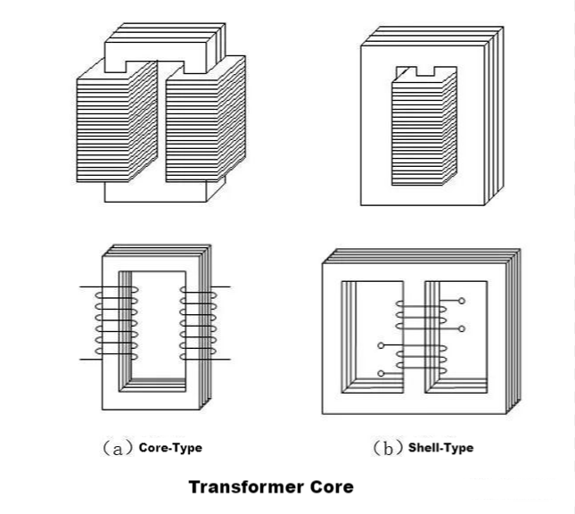 De acordo com o layout do enrolamento no núcleo, o transformador é dividido em núcleo e shell tipo dois. A diferença está principalmente na distribuição do circuito magnético, shell núcleo do transformador de jugo cercado da bobina, núcleo do transformador de núcleo na maior parte da bobina, apenas parte da bobina fora do jugo de ferro, usado para formar um laço magnético.