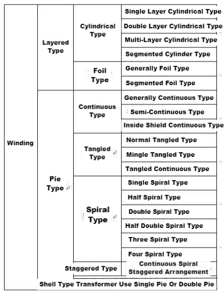 A estrutura do enrolamento do transformador pode ser geralmente dividida em duas categorias: estrutura de camada e estrutura de bolo. A estrutura da camada refere-se a que as espiras do enrolamento ao longo de seu eixo são dispostas continuamente, geralmente utilizadas nas séries S8 e S9 de transformadores de potência de baixa perda; A estrutura da torta refere-se a que as espiras do enrolamento são continuamente enroladas em uma torta (segmento) ao longo de sua direção radial e, em seguida, composta por muitas tortas dispostas ao longo da direção axial. É geralmente usado em transformadores grandes e extragrandes com alta tensão de 110kV e acima.