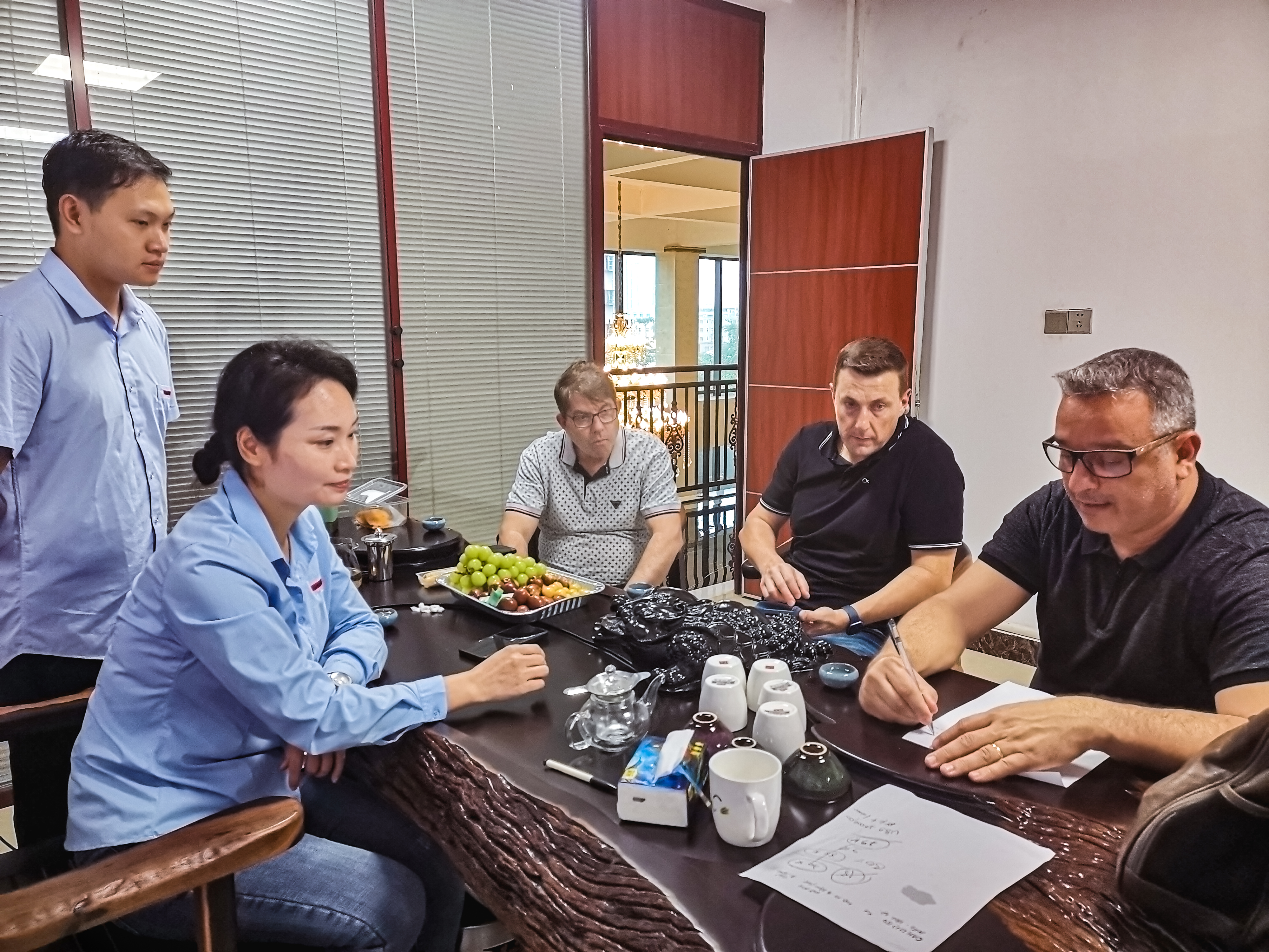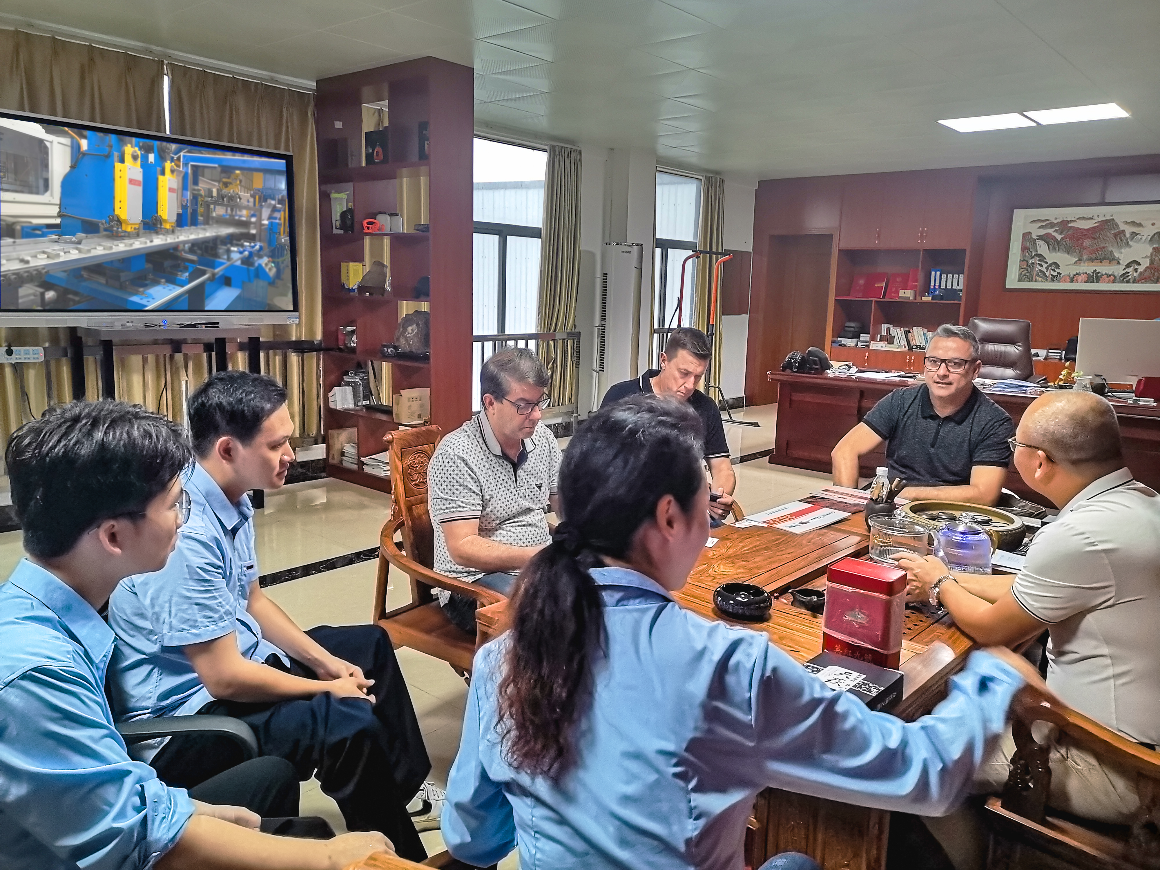 Em seguida, todo o pessoal do nosso departamento de comércio exterior conduziu os clientes brasileiros para visitar o escritório da empresa e a oficina de produção.