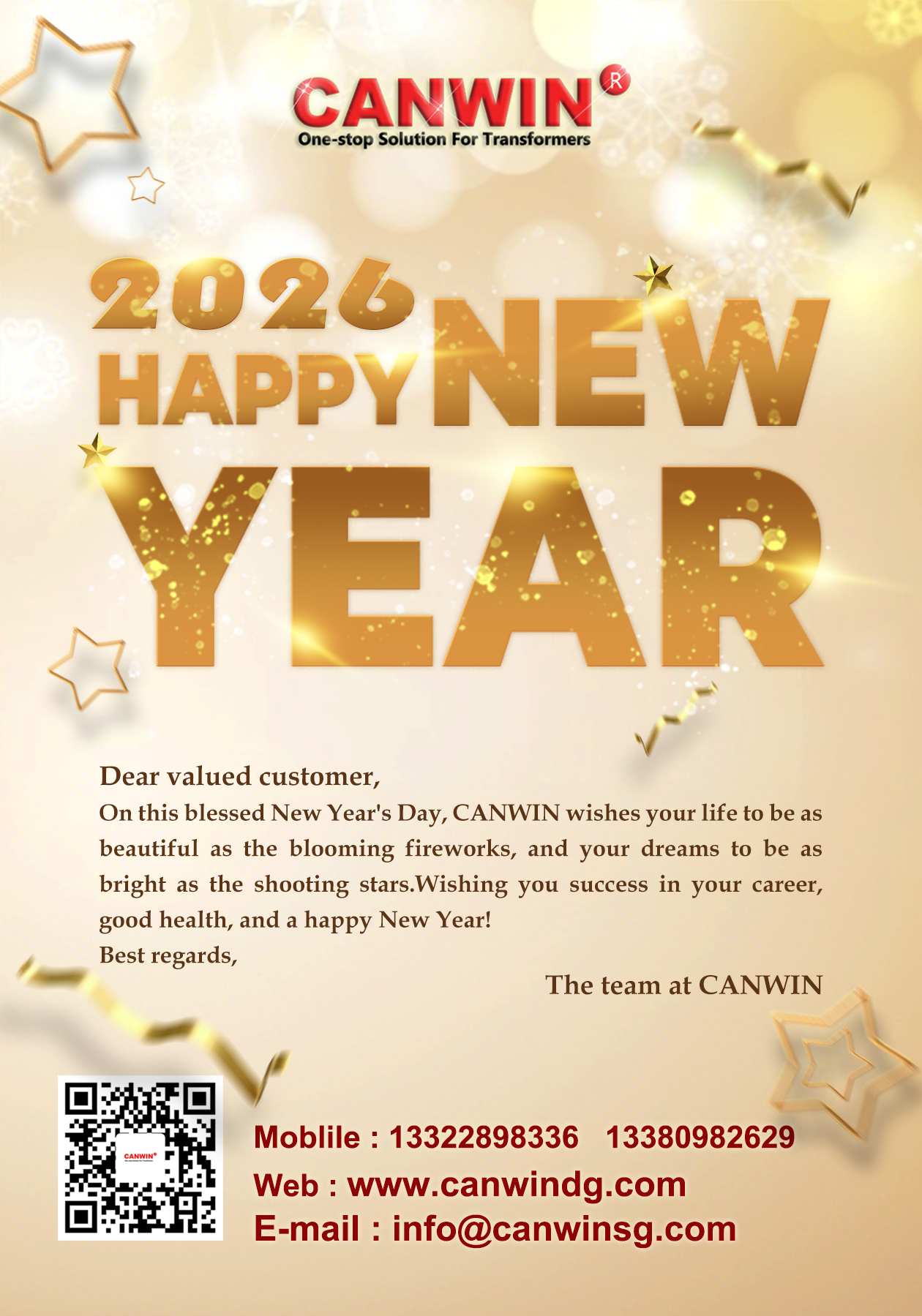 Macmiil qiimo leh, Maalintan barakaysan ee sanadka cusub, CANWIN waxay jeceshahay in noloshaada ay noqoto mid qurux badan sida dabka ubaxa leh, riyadaaduna ay noqoto mid dhalaalaysa sida xiddigaha toogashada. Waxaan kuu rajeynayaa guul shaqadaada, caafimaad wanaagsan, iyo sanad cusub oo farxad leh!