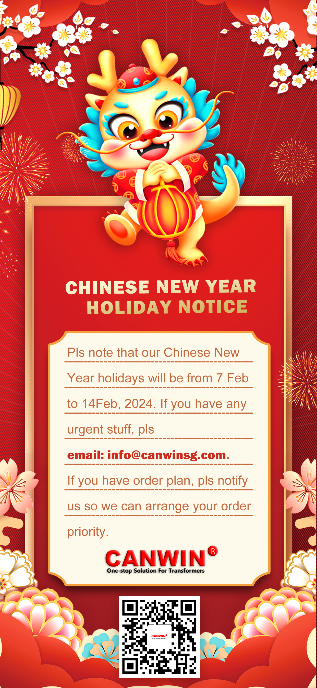 Mangyaring tandaan na ang aming mga pista opisyal sa Bagong Taon ng Tsino ay mula 7 hanggang 14Peb, 2024. Kung mayroon kang anumang mga apurahang bagay, pls