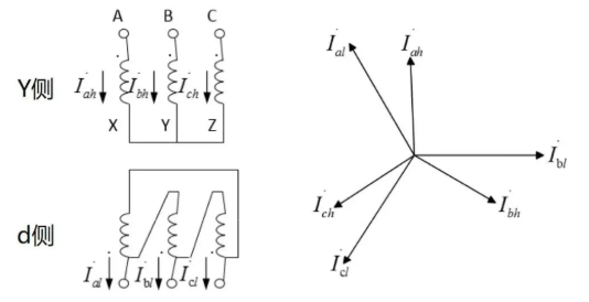 Ang pagkuha ng YN-d11 wiring bilang isang halimbawa, ang wiring diagram at kasalukuyang phasor diagram ay ipinapakita sa Figure 3. Makikita na dahil may 30° angle difference sa pagitan ng high at low side phasors, ang vector sum ng dalawang currents ay hindi 0 sa panahon ng normal na operasyon, at ang phase conversion ay kinakailangan muna. Pagkatapos ng conversion, ang mataas at mababang bahagi ng parehong yugto ay may parehong yugto.