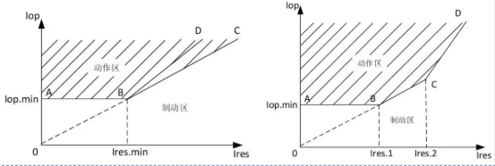 Upang higit pang mapagbuti ang pagiging sensitibo sa pagkilos sa kaso ng mga panloob na pagkakamali at mapagkakatiwalaang maiwasan ang hindi balanseng kasalukuyang ng mga panlabas na pagkakamali, ang longitudinal differential protection ay gumagamit ng isang elemento ng kaugalian na may curve na katangian ng pagpepreno ng ratio. Ang vertical axis ng ratio braking curve ay ang differential current, ang horizontal axis ay ang braking current, ang itaas na bahagi ng curve ay ang action area, at ang lower part ay ang braking area. Ang mga umiiral na curve na katangian ay pangunahing nahahati sa dalawang uri: dalawang-segment na broken-line na uri at tatlong-segment na broken-line na uri.