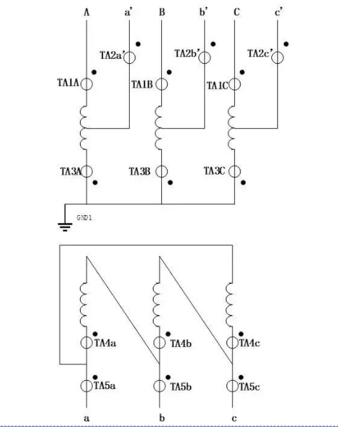 Ang split-side differential protection ay isang differential protection na kumukuha ng Y-side winding ng transformer bilang protektadong bagay, at binubuo ng una at huling CT ng mga windings sa bawat panig ayon sa phase. Ang pagkuha sa self-coupling phase A sa Figure 5 bilang isang halimbawa, ang proteksyon ay binubuo ng TA1A, TA2a' at TA3A. Ayon sa kasalukuyang batas ni Kirchhoff, walang electromagnetic coupling na relasyon sa pagitan ng mga agos sa magkabilang dulo, kaya ang proteksyon ay hindi nangangailangan ng inrush current blocking elements, differential snap-action elements at over-excitation blocking elements. Bilang karagdagan, ang nakapirming halaga ng kasalukuyang operating ng split-side differential protection ay mas mababa, at ang sensitivity ay mas mataas kaysa sa longitudinal differential protection. Ngunit ang kawalan ng proteksyon na ito ay hindi nito maprotektahan ang inter-turn short circuit.