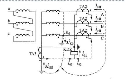 Ang zero-sequence differential protection ay binubuo ng zero-sequence current transformer sa neutral point side ng transformer at zero-sequence circuits ng kasalukuyang transformer sa star side ng transformer. Ang mga figure 6 at 7 ay ang kasalukuyang mga loop kapag ang mga ground fault ay nangyari sa labas ng zone at sa loob ng zone, ayon sa pagkakabanggit. Katulad nito, ang mga pangalawang agos ng proteksyon na ito ay walang electromagnetic coupling na relasyon, kaya ang proteksyon na aparato ay hindi nangangailangan ng isang elemento ng pag-block ng kasalukuyang pagpasok ng paggulo o isang elemento ng pagharang sa labis na paggulo; sa parehong oras, ito ay mas sensitibo sa grounding fault ng transformer winding. Gayunpaman, maaari lamang ipakita ng zero-sequence differential protection ang internal ground fault ng mataas at katamtamang boltahe na bahagi, at hindi mapoprotektahan ang inter-turn short circuit.