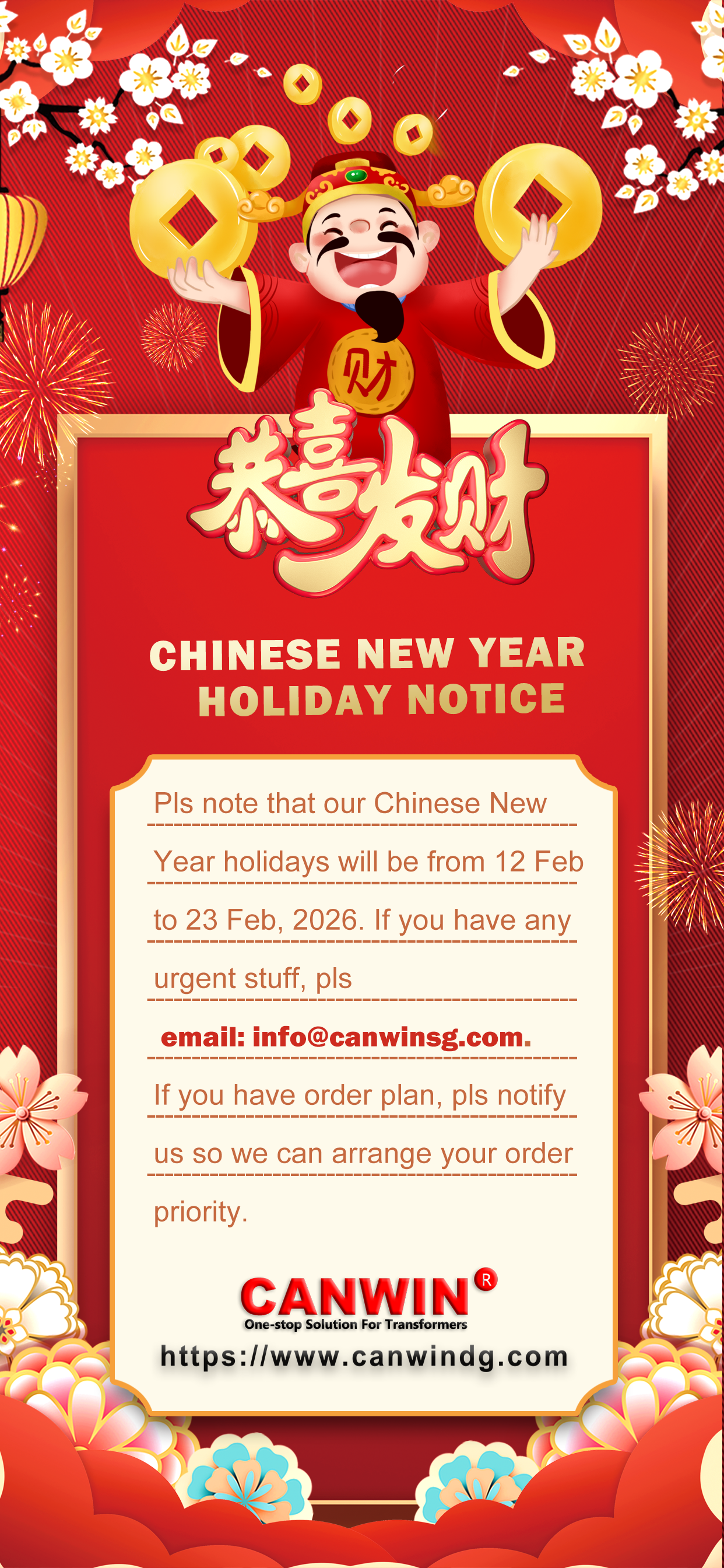 Sicela uqaphele ukuthi amaholide ethu oNyaka Omusha waseShayina azoba kusukela mhla ziyi-12 kuNhlolanja kuya kumhla zingama-23 kuNhlolanja, 2026. Uma unezinto eziphuthumayo, sicela usithumelele i-imeyili ku: info@canwinsg.com. Uma unohlelo lwe-oda, sicela usazise ukuze sikwazi ukuhlela ukuthi i-oda lakho libaluleke kangakanani.